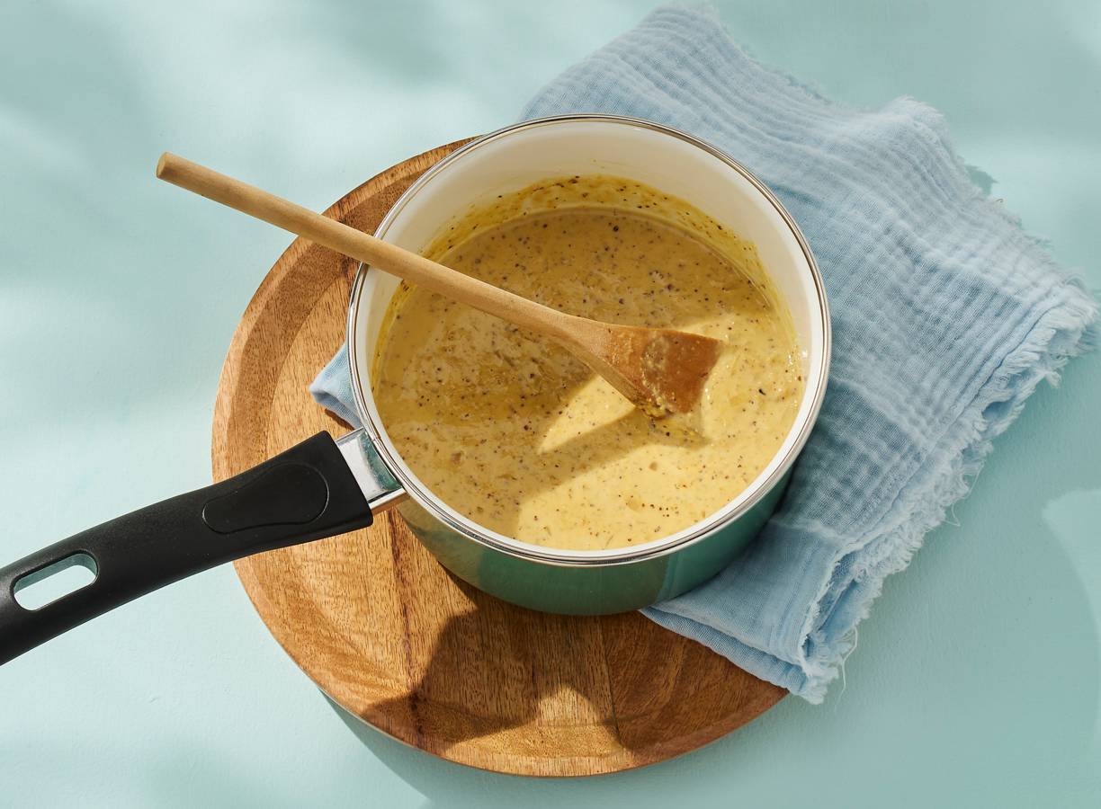 Lekker bij beenham, prei of aardappelen, deze mosterdsaus.