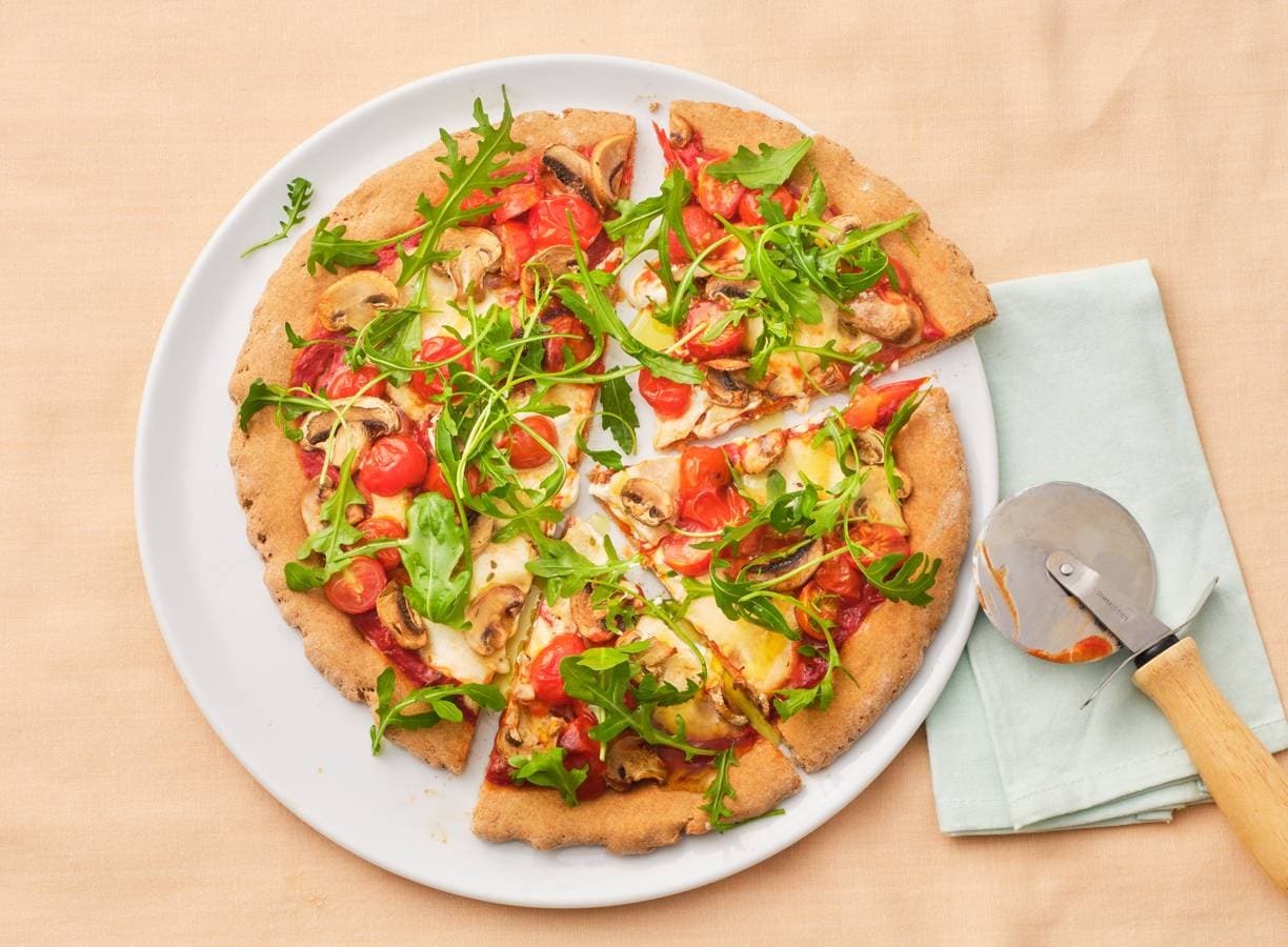 Een vega pizza maak je met cherrytomaten, champignons en mozzarella. Is-ie nog gezond ook!