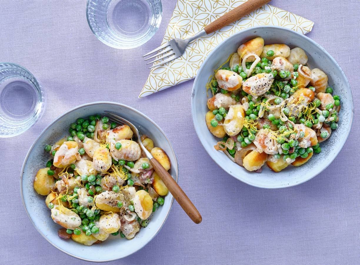 Gebakken gnocchi met tuinerwten en kruidenzuivelspread