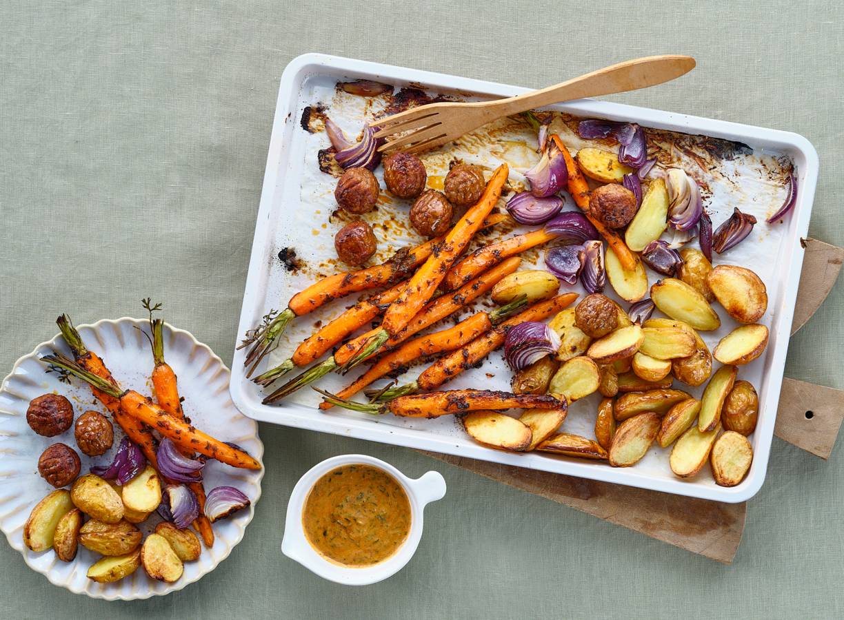 Haal de krieltjes na 20 min. uit de oven en schuif naar één kant van de bakplaat. Verdeel de bospeen, ui en Zweedse balletjes over de lege kant van de bakplaat en rooster nog ca. 30 min. Breng op smaak met peper en eventueel zout.