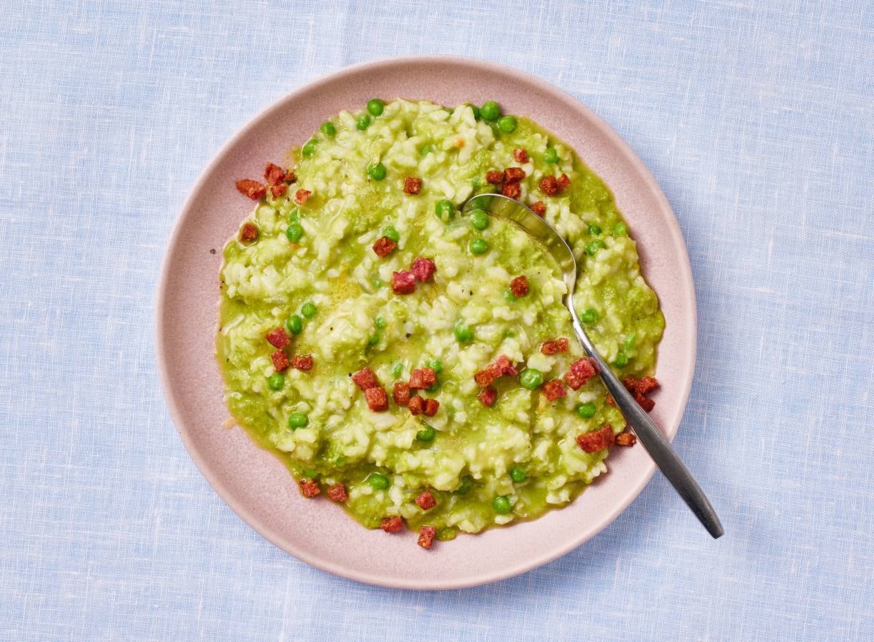 Trek in Italiaans? Deze romige lenterisotto met tuinerwten en knapperige salami is om je vingers bij af te likken.