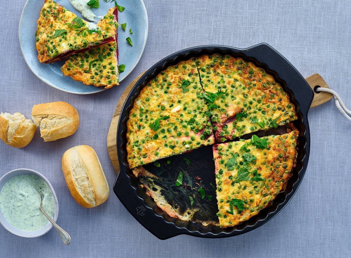Lekker veel groen, wij zeggen: doen! Dat wordt een eitje met deze frittata gevuld met lentegroente en munt.