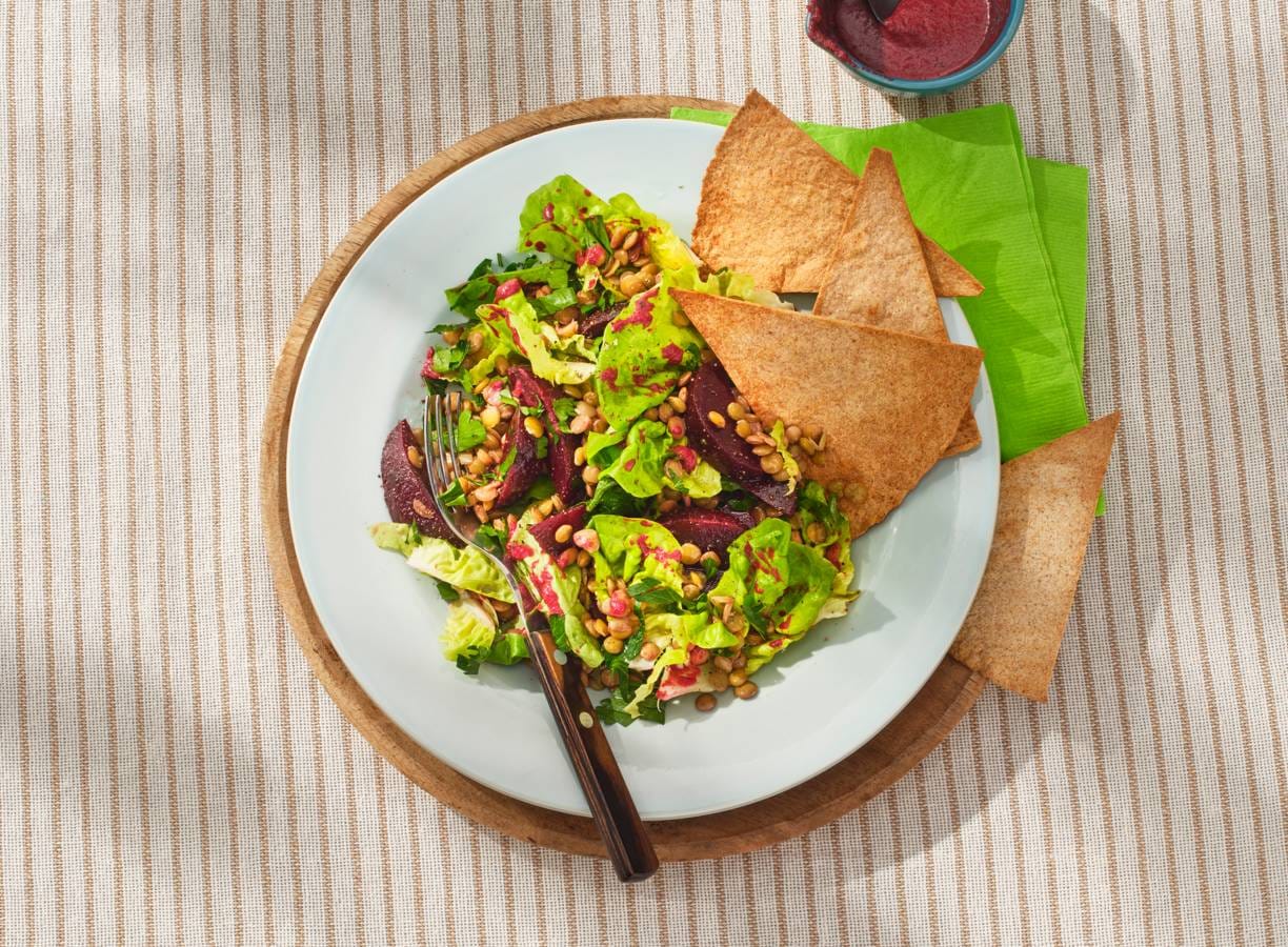 Linzensalade met gemarineerde biet en volkorentortillachips