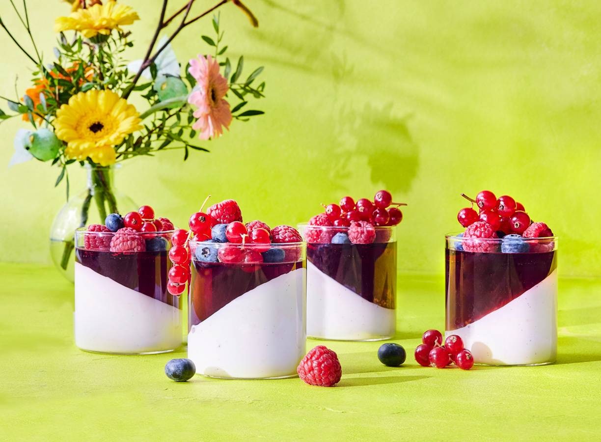 Verdeel voor het serveren het verse fruit over de panna cotta.