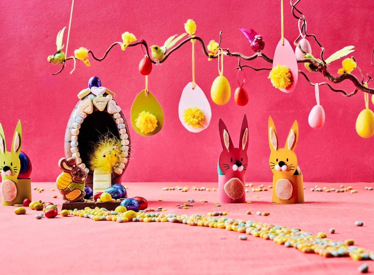 Decoreer het paashuisje met de rest van de hazelnootpasta en de verschillende soorten snoep.