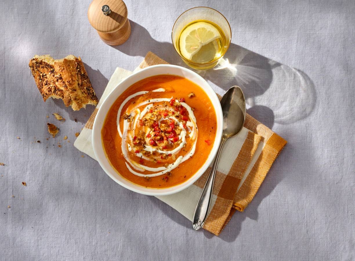 Romige wortel-paprikasoep met walnoten? Check! Serveer met meergranenstokbrood et voilà: een smaakvol hoofdgerecht.