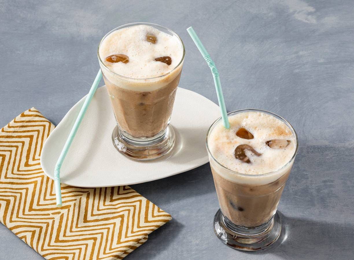 Giet de dadelmelk in de glazen en doe de ijsblokjes erbij. Giet de espresso erover, zet de rietjes in de glazen en serveer direct.