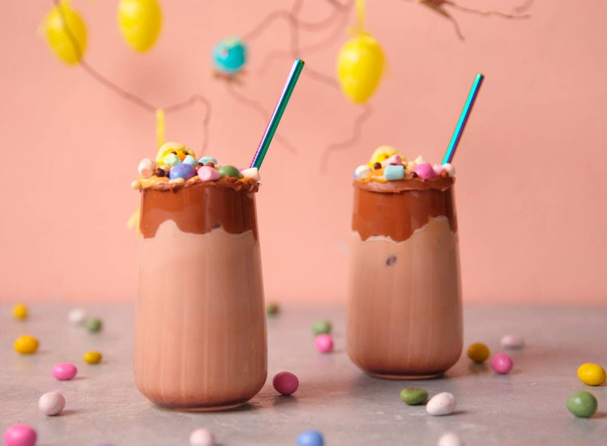 Dalgona + chocolademelk = een feestelijke paaskoffie. Maak deze paaskoffie extra gezellig met minimellows, chocomix en paaschocolade.