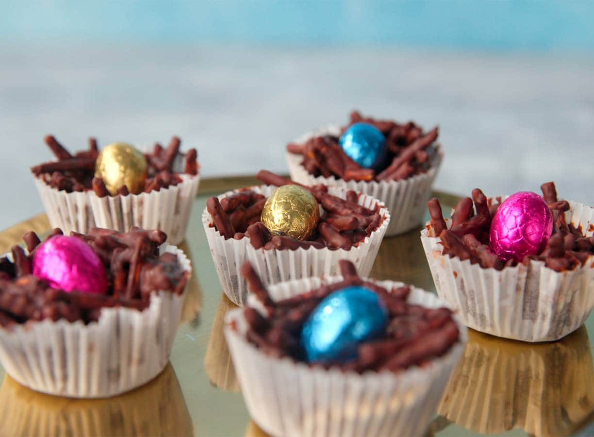 Schep de pepselstukjes door de gesmolten chocolade en verdeel over de met muffinvormpjes beklede muffinholten. Vorm met een theelepel tot nestjes. Laat de nestjes 30 min. opstijven in de koelkast.