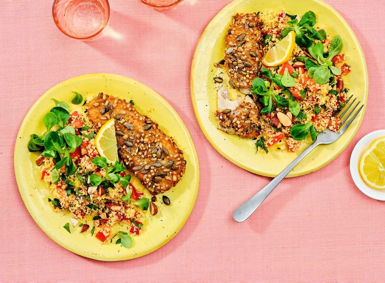 Couscoussalade met gegrilde paprika en visfilet uit de oven