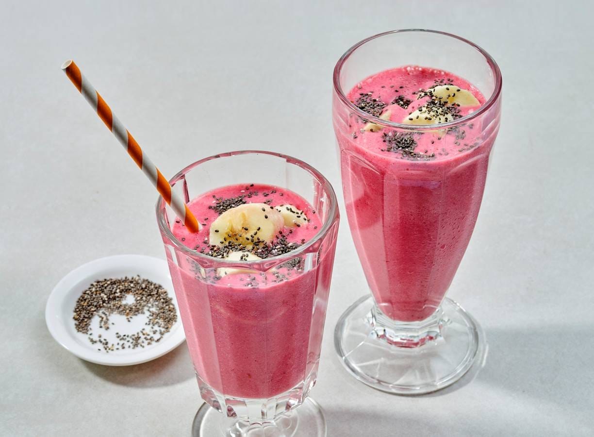 Verdeel over glazen en garneer met de rest van de plakjes banaan. Bestrooi met het chiazaad.