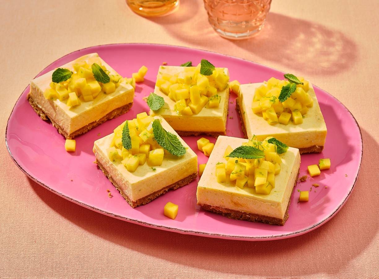 Meng het mangomengsel door de kwark, verdeel over de bodem van de taart en laat in 3 uur opstijven in de koelkast. Haal de blaadjes munt los. Snijd de taart in 9 stukken en verdeel de rest van de mango, de muntblaadjes en het limoenrasp erover.
