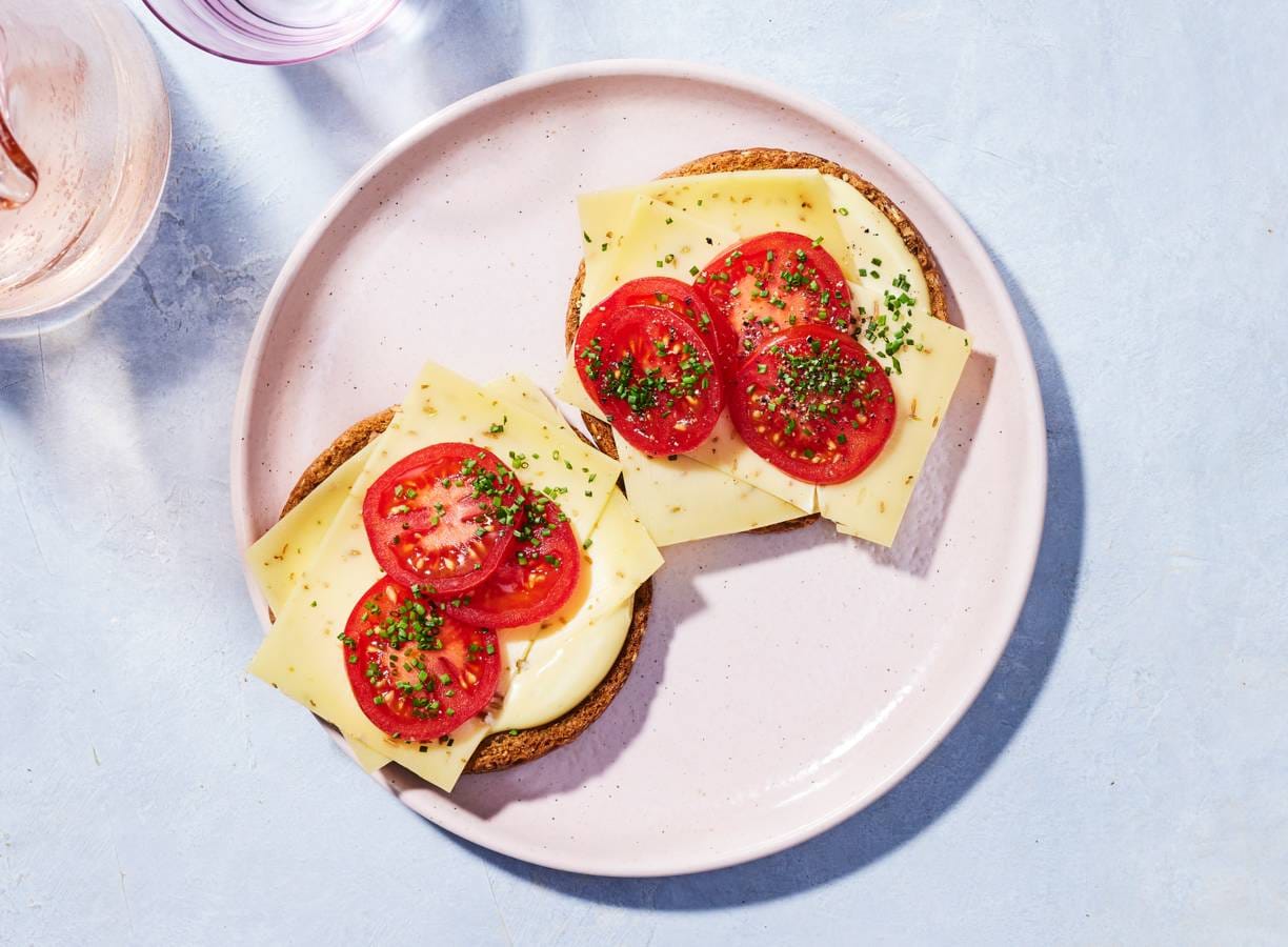 Speltbeschuit met komijnekaas, tomaat en mosterdmayo