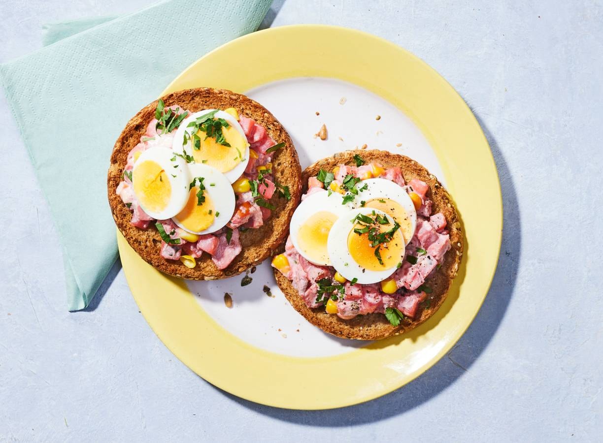 Speltbeschuit met roze huzarensalade