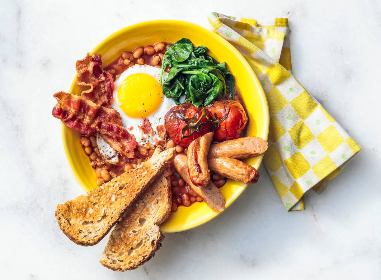 Snijd de chipolata’s elk in 4 schuine stukken. Snijd de toast diagonaal. Schep de witte bonen in het midden van de kommetjes. Verdeel de spek, stukjes chipolata, gepofte tomaatjes, spinazie, spiegeleieren en toast eromheen. Schep wat van de vrijgekomen sappen van de tomaat over de tomaten.