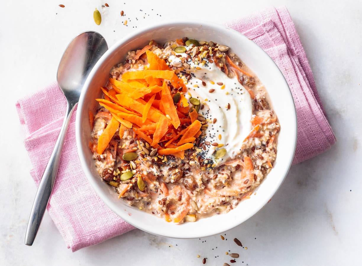 Liefhebbers van carrotcake opgelet! Deze carrotcake-overnight-oatsbowl wil jij. Zo eet je jouw favoriete cake ook als ontbijt.