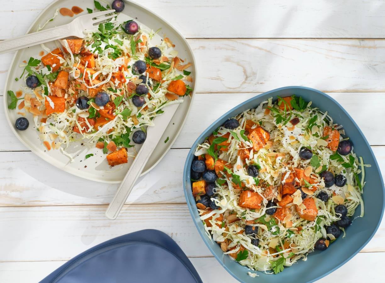 Zoete-aardappelsalade met blauwe bessen en yoghurtdressing