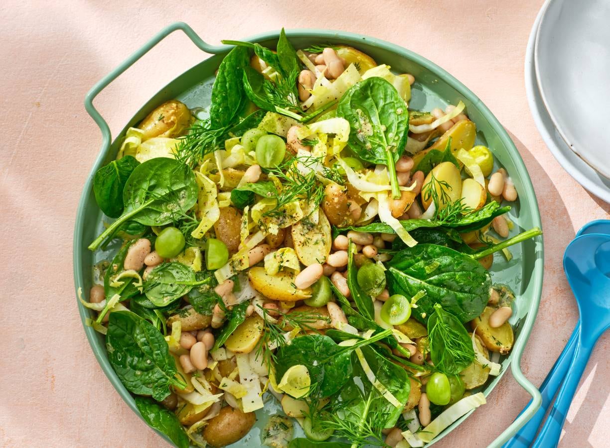 Witlof-aardappelsalade met cannelinibonen, spinazie en druiven