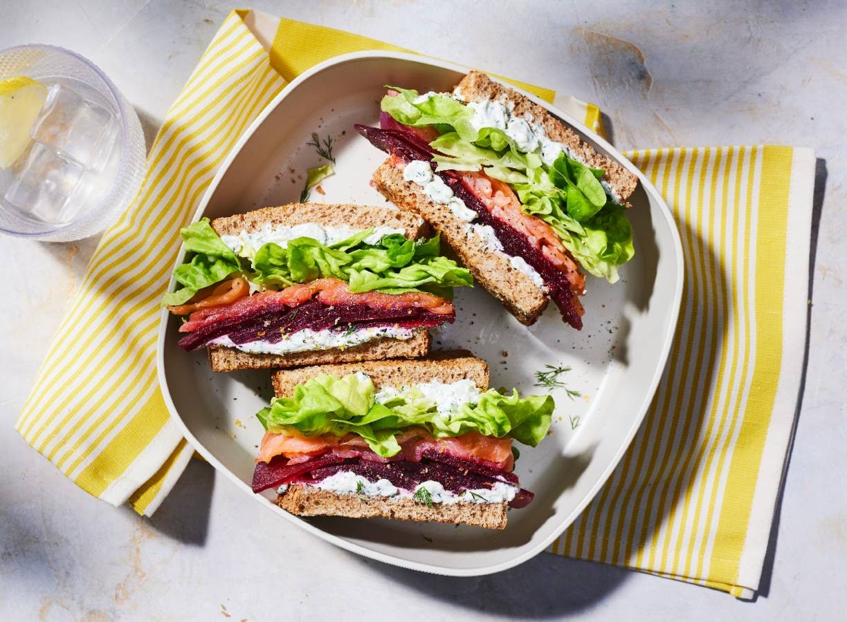 Sandwich met zalm, ricottaspread en rode biet