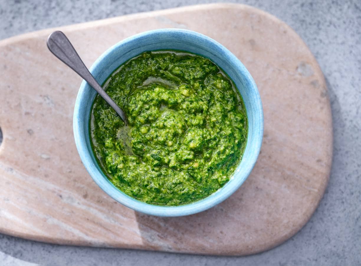 Pureer met een staafmixer tot een pesto. Breng op smaak met peper en eventueel zout.