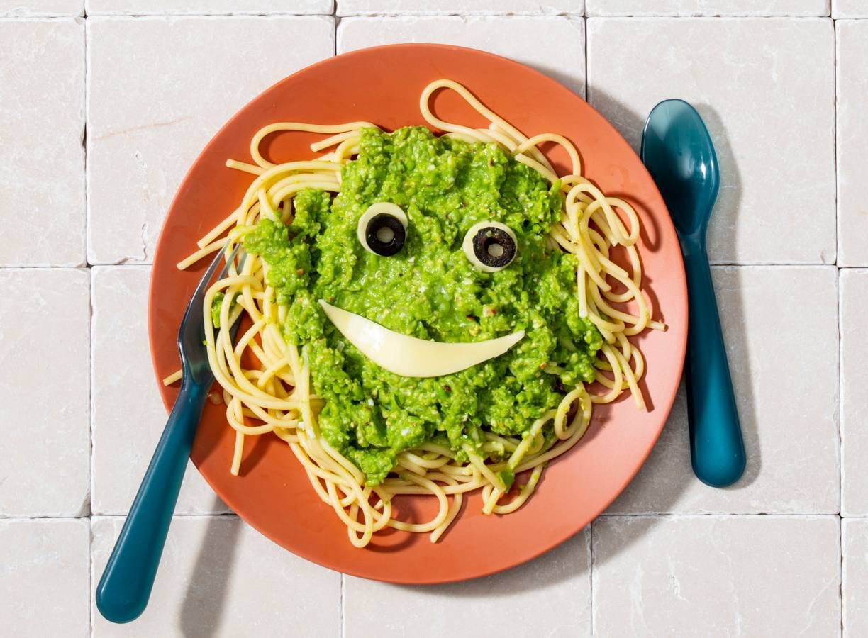 Leg op de spaghetti voor de kinderen 2 kaascirkels en daaronder de mond. Leg in het midden van de cirkels een plakje olijf.