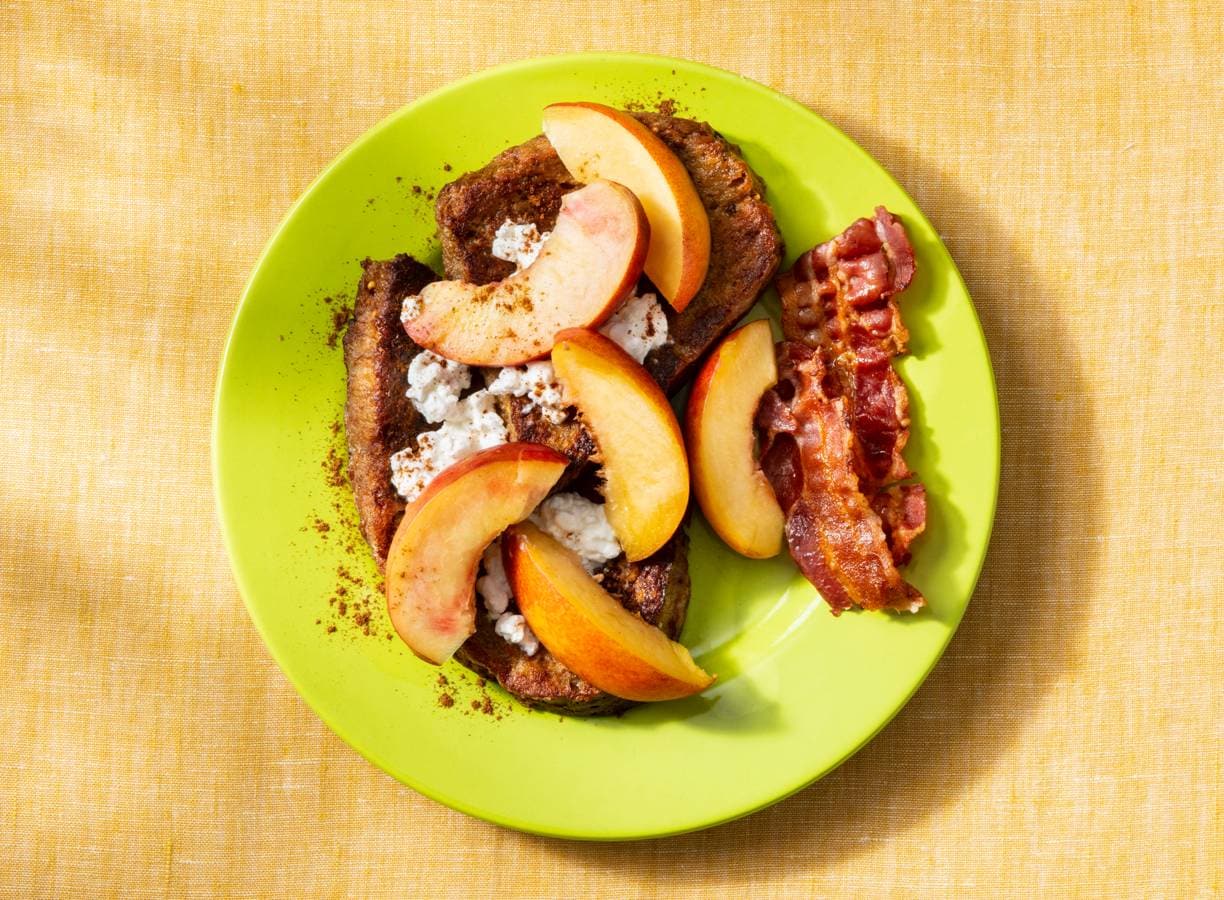 Verdeel de wentelteefjes over de lunchtrommels. Verdeel de cottagecheese over de kleine bakjes, verdeel de perzikparten over de wentelteefjes, bestrooi met de rest van de kaneel en leg het spek erbij.