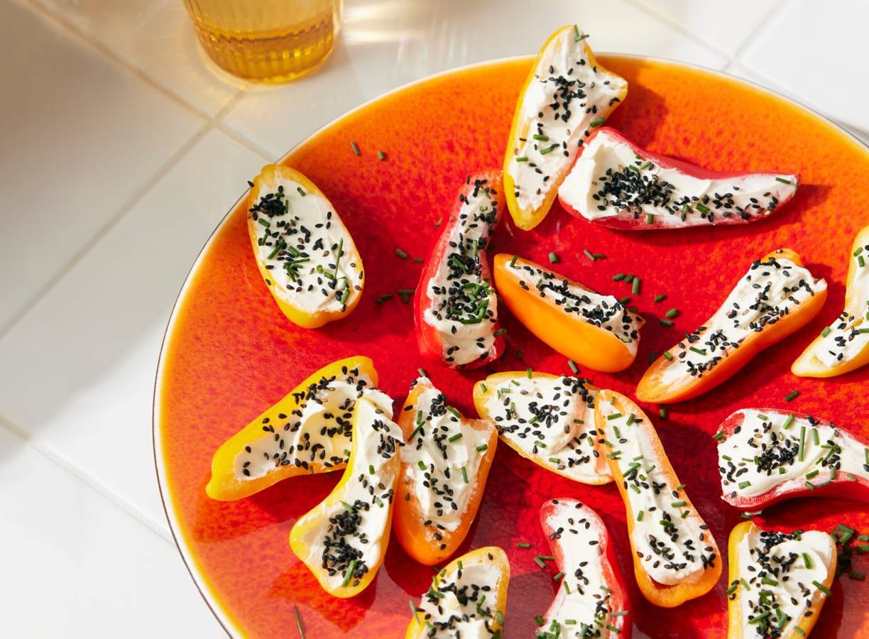 Vul de halve paprika’s met de zuivelspread en bestrooi met de bieslook en het sesamzaad. Bestrooi met peper en eventueel zout.