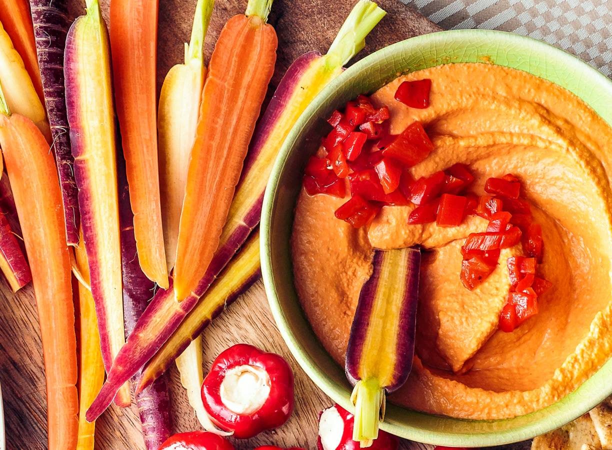 Dippen in paprika-hummus is sowieso al een goed idee, maar met deze regenboogwortel wordt het nóg feestelijker. Zet de (borrel)plank maar vast klaar!
