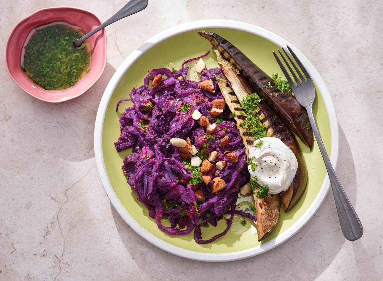 Stamppot van paarse aardappel, rodekool en gegrilde aubergine