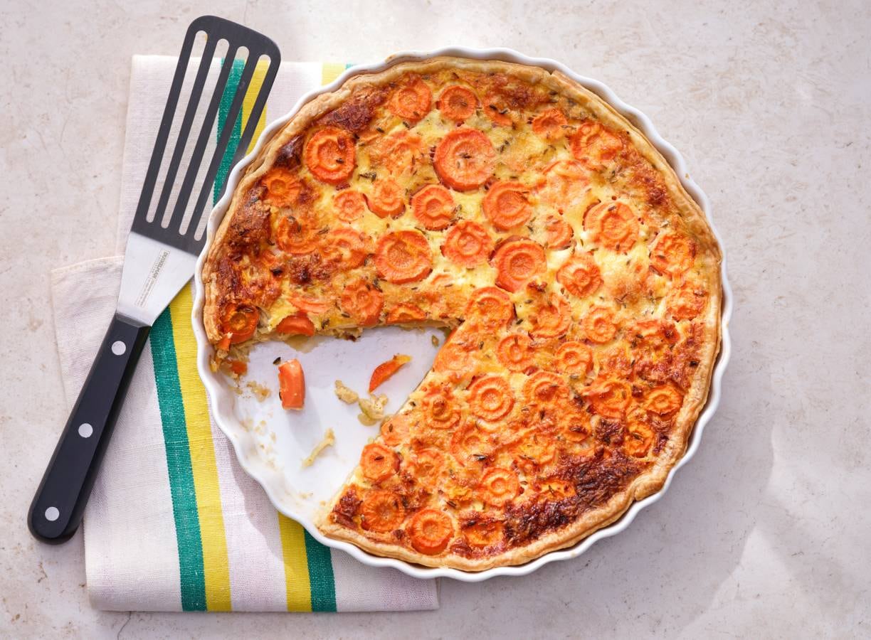 Bekleed de quichevorm met het bladerdeeg en prik met een vork gaatjes in de bodem. Verdeel de ui over de bodem van de quiche en leg de plakjes peen er mooi op. Begin bij de randen en werk naar het midden toe. Schenk voorzichtig het eimengsel erbij. Dek de quiche af met aluminiumfolie en bak ca. 30 min. in de oven. Haal de folie eraf en bak nog ca. 20 min.