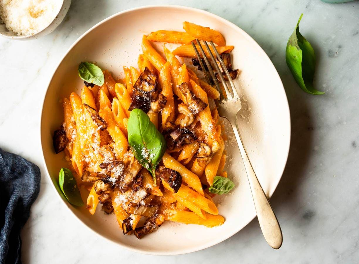 Serveer de pasta en voeg de gebakken aubergines toe, werk af met een blaadje basilicum en rasp de Parmezaanse kaas erboven.