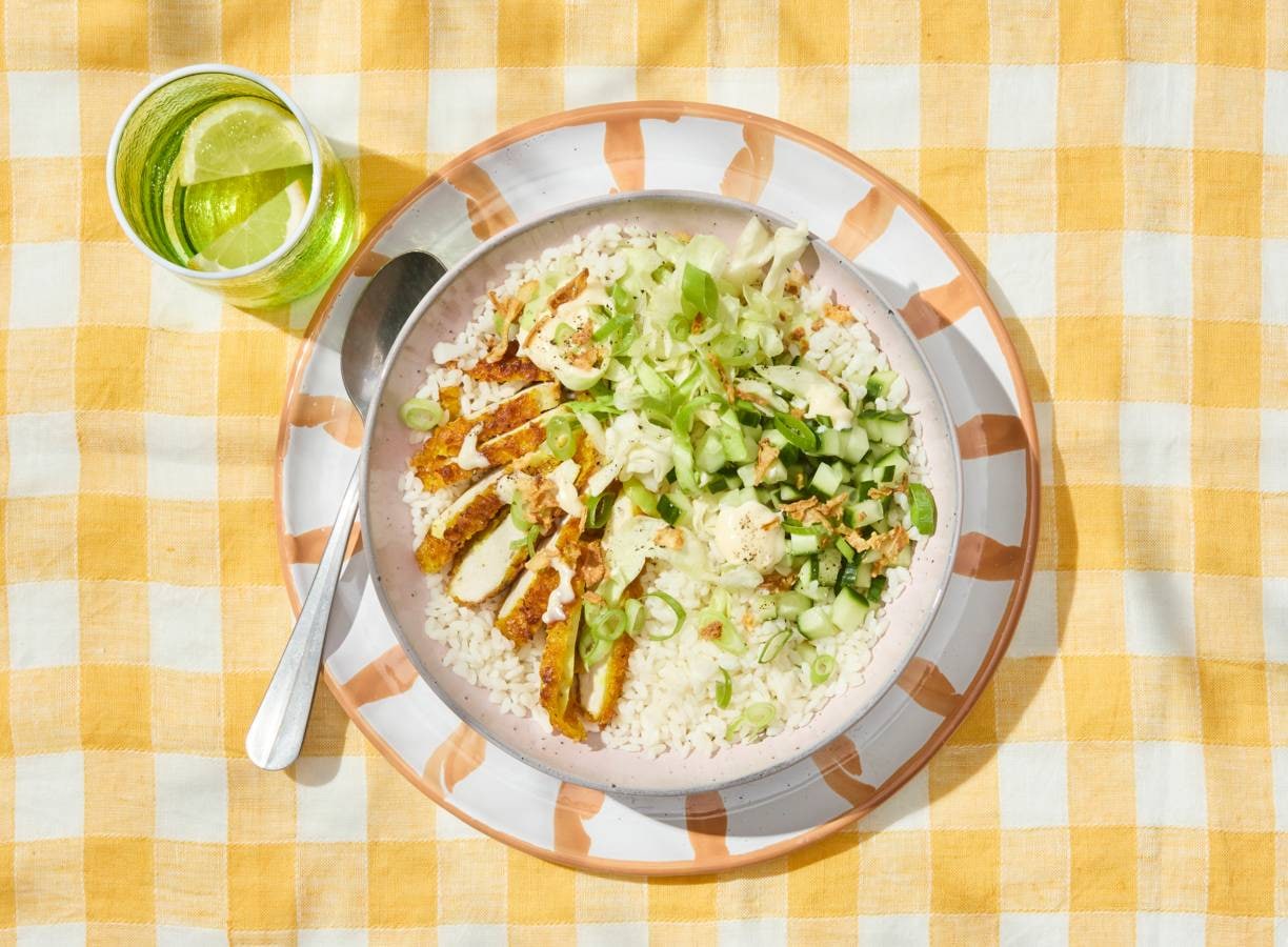 Snelle rijstbowl met krokante kip en spitskool