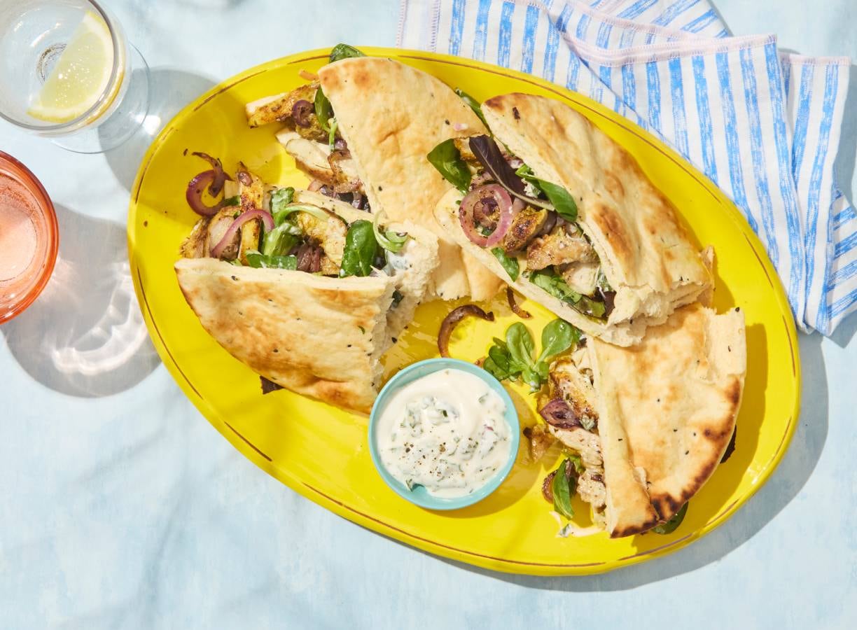 Snijd de kip in dunne plakjes. Besmeer de naanbroden met de muntyogonaise en beleg de helft van het naanbrood met de sla, kip en rode ui. Dek af met de rest van het brood, snijd doormidden en serveer.