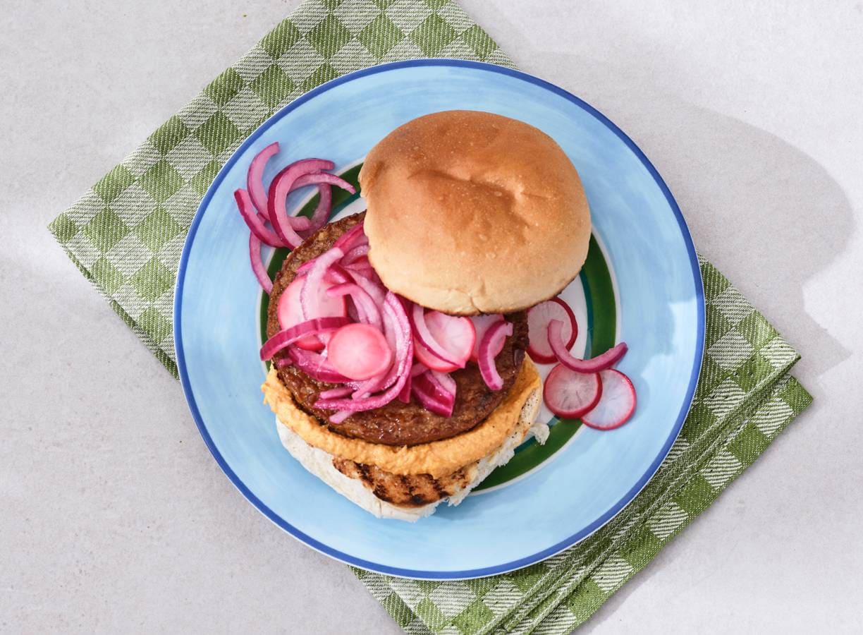 Besmeer 1 helft van de broodjes met de hummus en beleg met de vegaburger, radijs en rode ui.