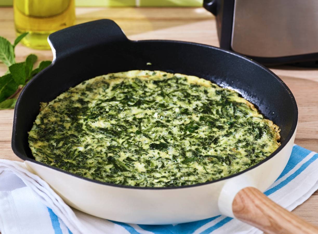 Verhit de olie in een grote koekenpan met antiaanbaklaag en schenk het spinazie-eimengsel erin. Bak de omelet op laag vuur met de deksel op de pan in 14 min. net gaar.