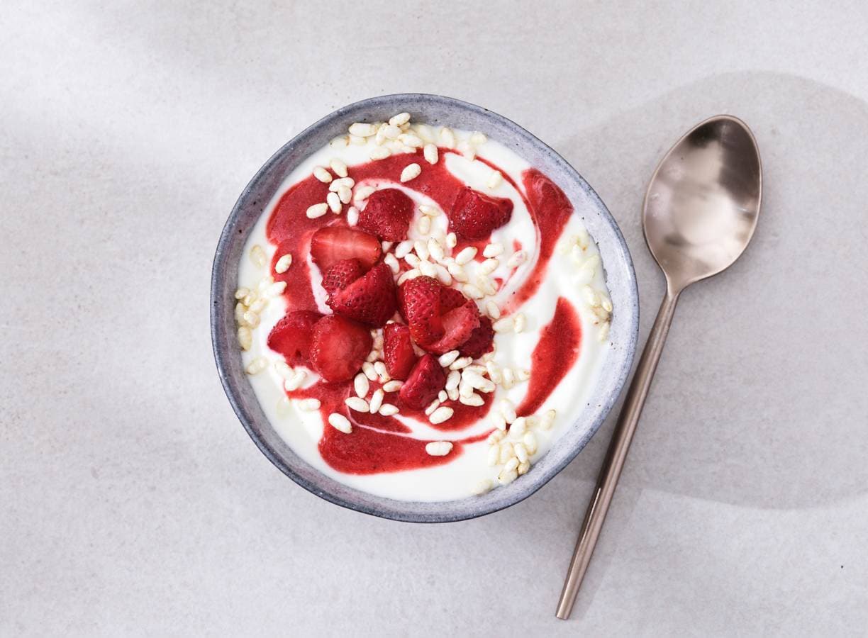 Moet je proberen: yoghurt met gepofte rijst. Een heerlijk ontbijt dat je aanvult met aardbeien.