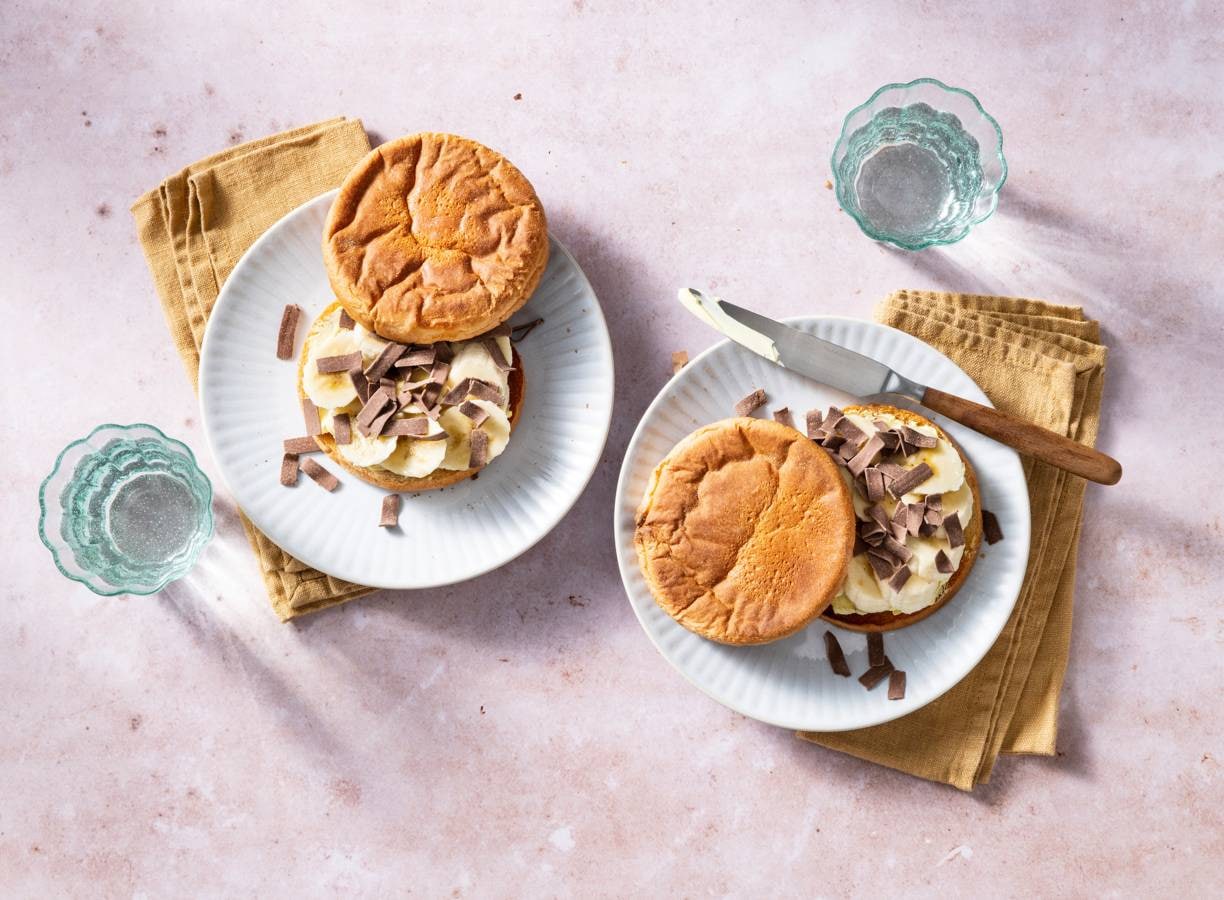 Beleg de helft van de geroosterde beschuitbollen met de plakjes banaan en bestrooi met de vlokken. Top af met de rest van de beschuitbolhelften.