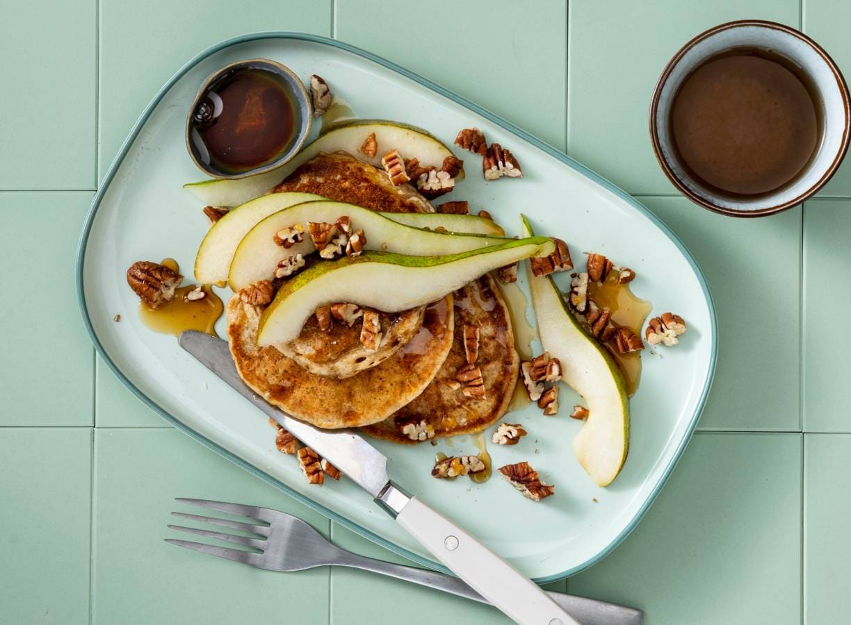 Vegan pancakes met peer en ahornsiroop
