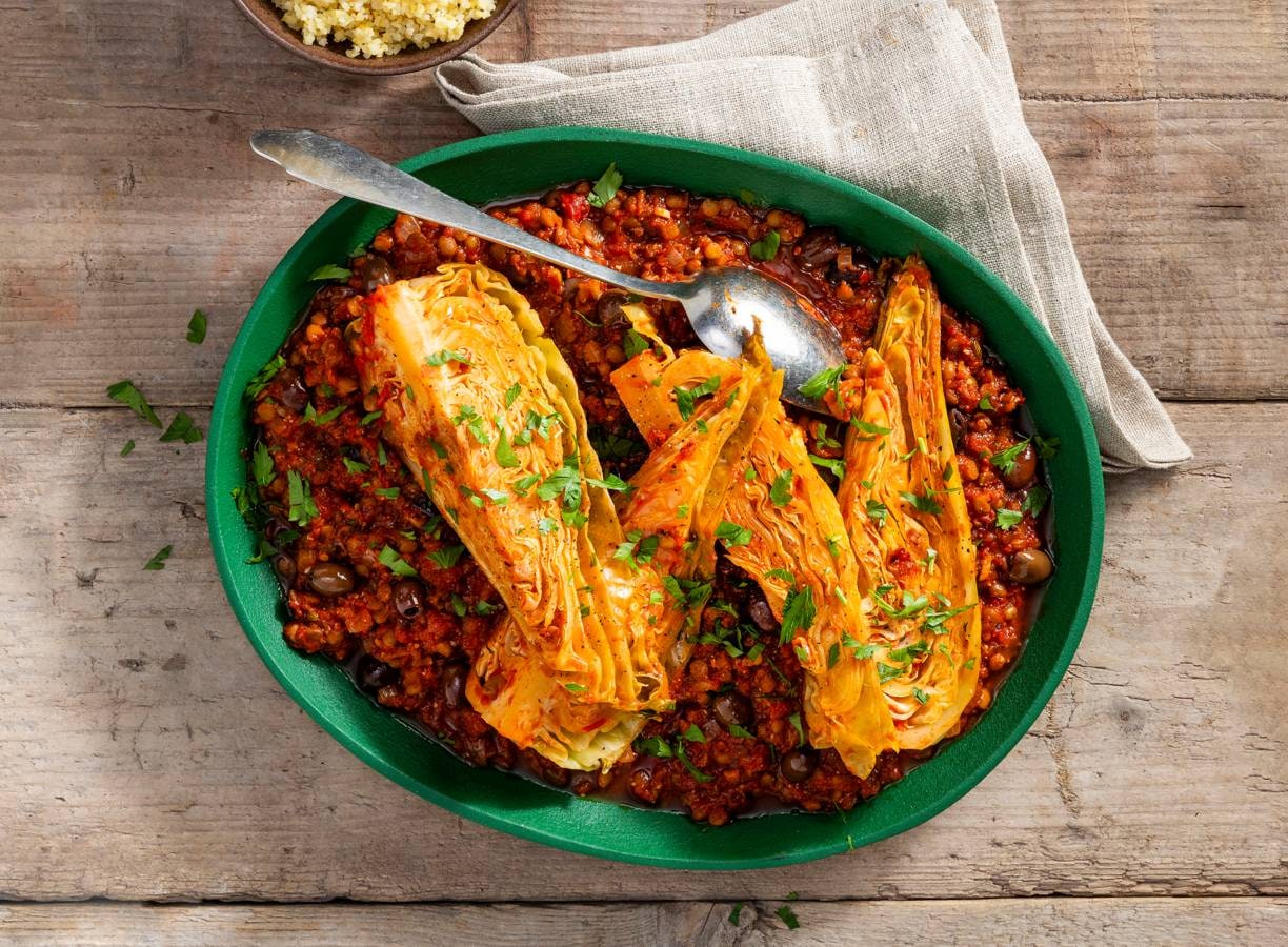 Vegan stoof maken? Goed idee! Dat doe je met tomatensaus, olijven en spitskool. Creëer extra smaak met misopasta en serveer met bulgur.