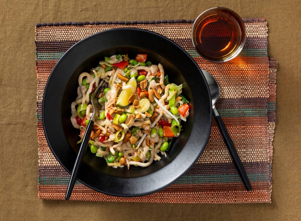 Romige noedels maak je met maar één pan en ingrediënten als pindakaas, kokosmelk en Chinese wokgroente. En het frisje? Dat is te danken aan de limoen!