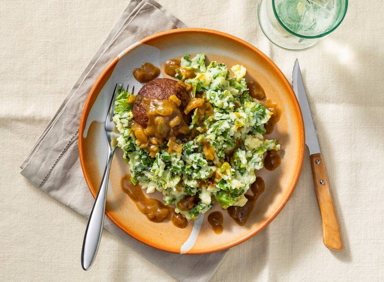 Een winterse favoriet is het zeker: andijviestamppot! Dit keer in een plantaardig jasje met amandeldrink en een vegan gehaktbal per persoon. Laat die koude dagen maar komen!