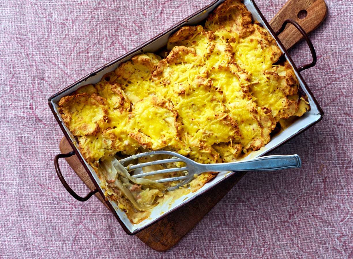 Vet de ovenschaal in met de rest van de plantaardige boter. Verdeel de witlof over de bodem van de ovenschaal. Schenk de bechamelsaus gelijkmatig over de witlof en verdeel de speckjes erover. Verdeel de aardappelpuree en de rest van de plantaardige kaas erover. Bak de witlofschotel in het midden van de oven in 40-45 min. gaar.