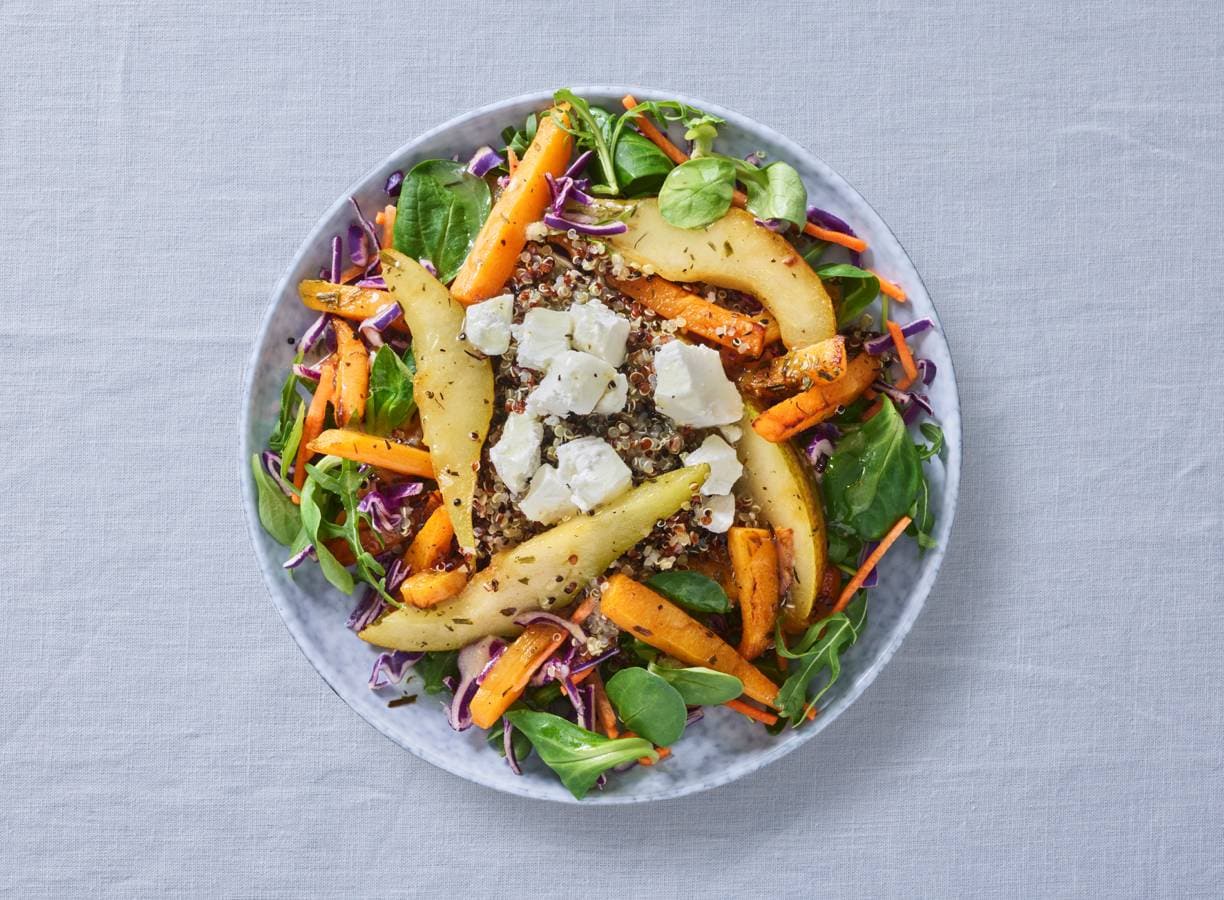 Verdeel de sla- en groentemix over de borden, verdeel hier de geroosterde pompoen en peer, de quinoa en geitenkaas over.