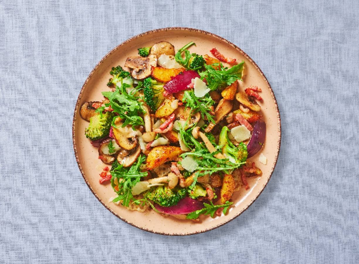 Verwarm de oven voor op 200 °C. Verdeel de aardappelpartjes, groentemix, broccoli en de spekreepjes over een met bakpapier bedekte bakplaat.