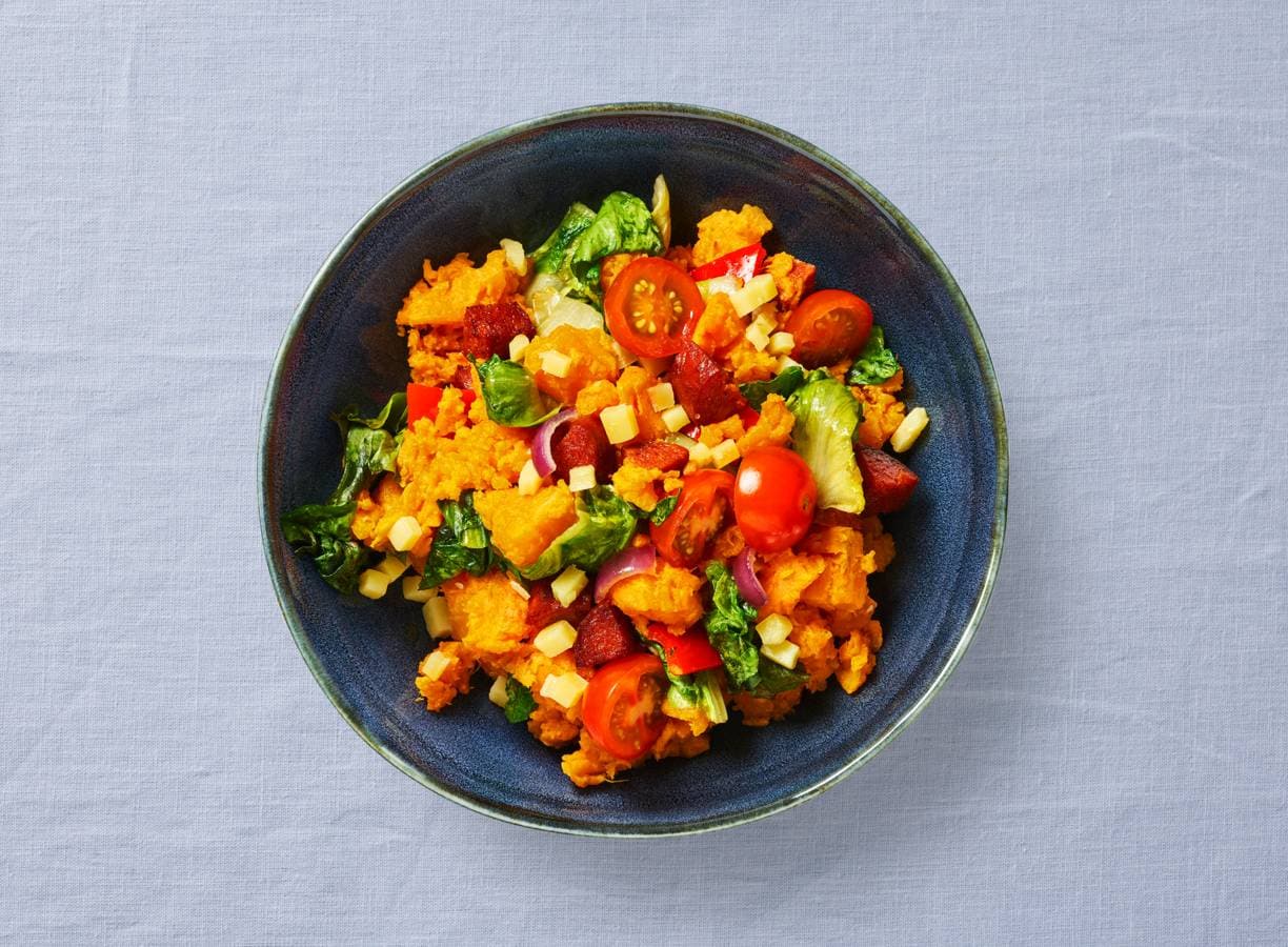 Een stamppot van zoete aardappel met paprika en sperziebonen. Met het verspakket van Albert Heijn heb je, op de rookworst na, alles in één keer in huis!