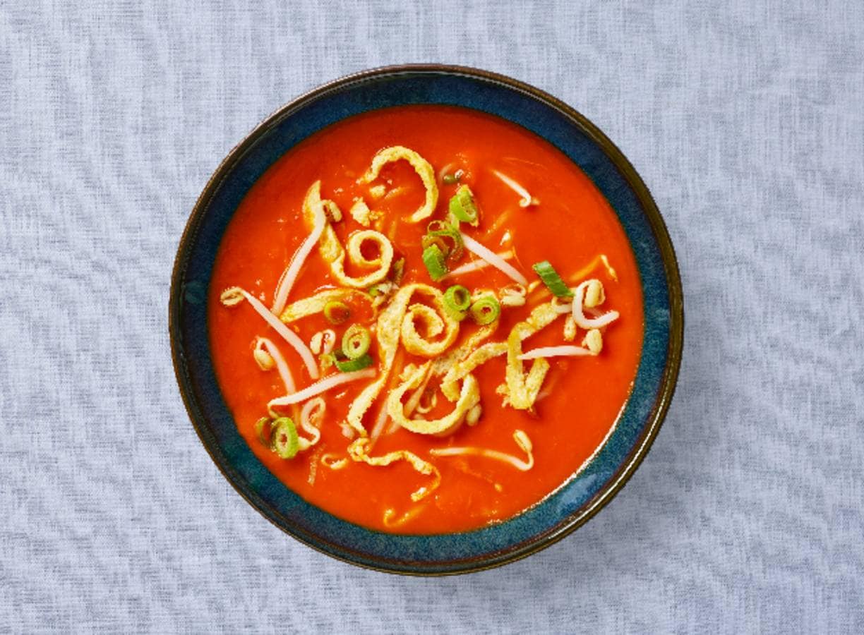 Deze 'Chinese' tomatensoep heeft het allemaal: reepjes ei, taugé en als extra smaakmaker: appel! Voordeel: het meeste zit al compact in een verspakket.