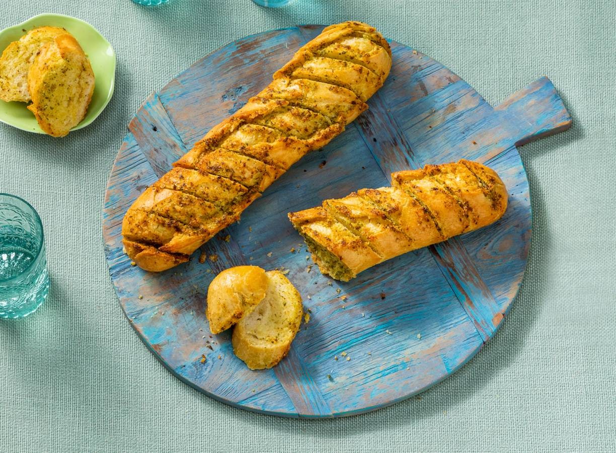 Maak 9 schuine sneetjes in de baguettes, maar snijd ze niet helemaal door. Smeer de kruidenboter tussen de sneetjes, leg op een met bakpapier beklede bakplaat en bak ca. 10 min. in de oven.