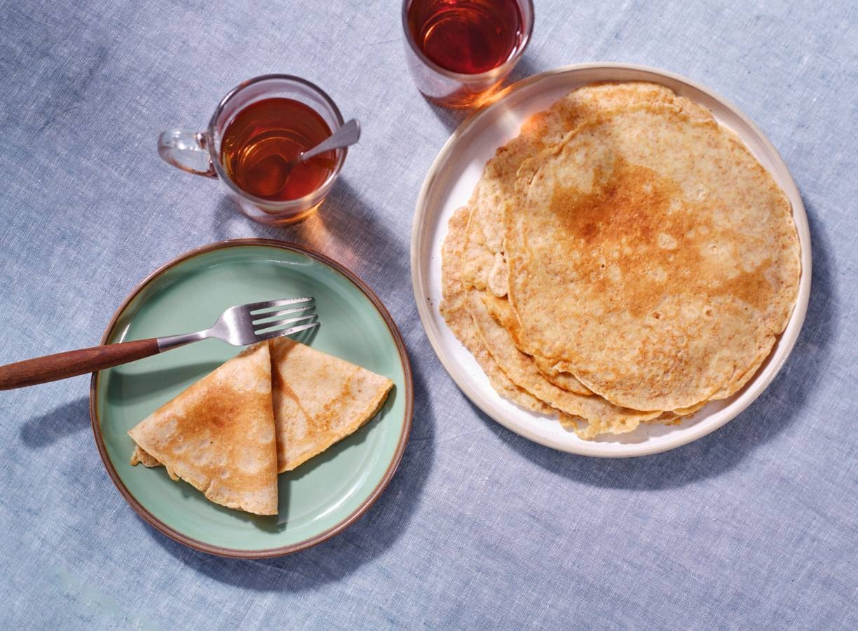 bereidingstip:Wij gebruikten een soeplepel van 125 ml en een pan van Ø 30 cm. Zo krijg je mooie dunne pannenkoeken. Gebruik per pannenkoek iets minder beslag als je een kleinere koekenpan hebt.