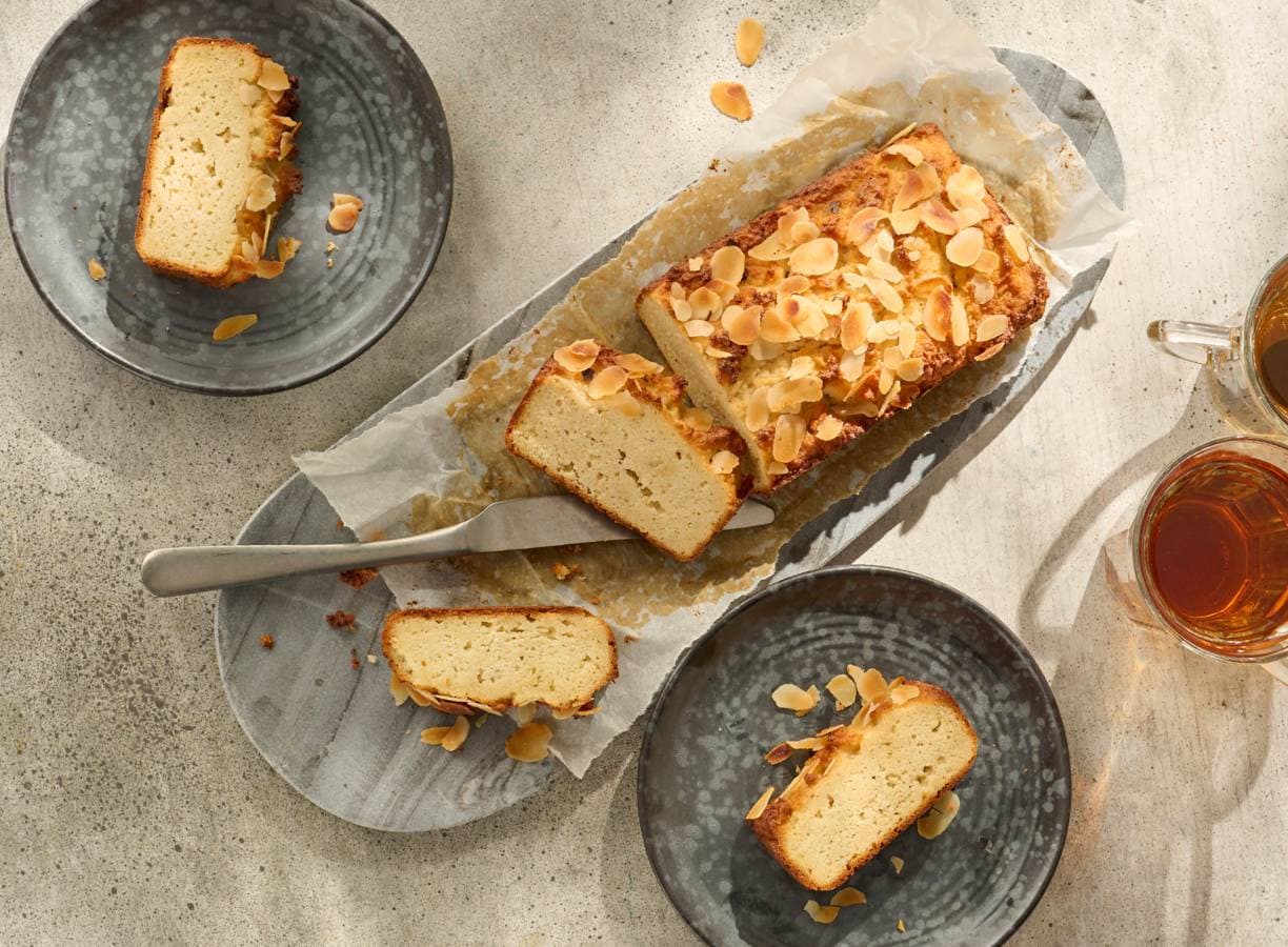 Bekleed de cakevorm met bakpapier. Schep het beslag in de cakevorm en strooi het amandelschaafsel erover. Bak de cake in ca. 40-45 min. gaar. Laat de cake 15 min. afkoelen in de vorm en vervolgens 30 min. uit de vorm op een rooster.