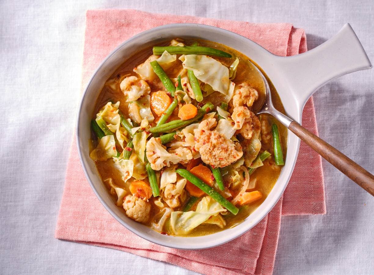 Doe de wortel en bloemkool in de wok en kook 3 min. Voeg de kokoscrème, sperziebonen en kool toe en kook nog 3-4 min. tot de groenten beetgaar zijn. Breng op smaak met peper en eventueel zout.